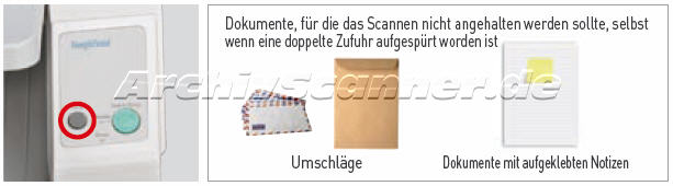 Falls das Scannen aufgrund der Doppeleinzugserkennung angehalten wird, drücken Sie einfach auf die DFS (Double Feed Skip) Taste, um das Scannen fortzusetzen. Diese Funktion eignet sich z.b. für das Scannen von Brief-Umschlägen, Belegen mit aufgeklebten Notizen oder Fotos.