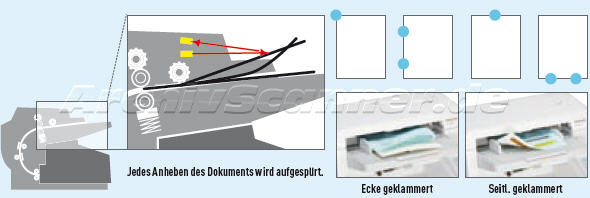 Zahlreiche Sensoren werden verwendet, um unterschiedliche Arten von gehefteten Dokumenten zu erkennen und den Scanner unverzüglich anzuhalten, wenn eine Klammerung erkannt wird. Dies reduziert die Beschädigung sowohl des Dokuments als auch des optischen Glases.